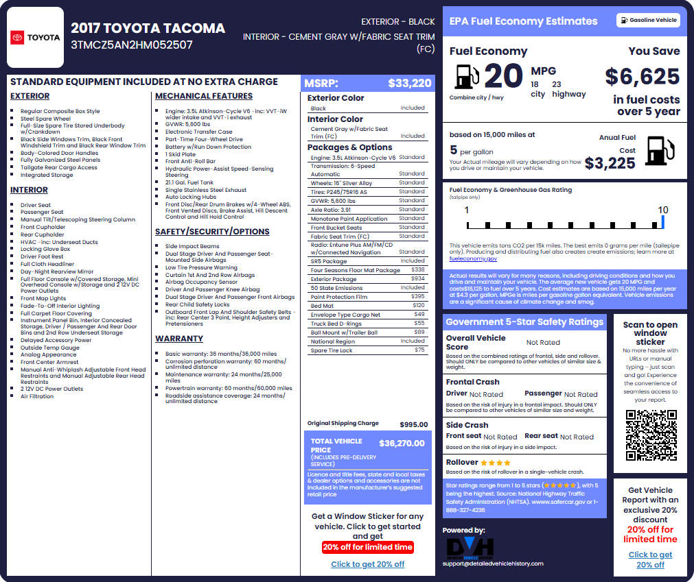 A window sticker reveals the make, model, year, and trim of the vehicle. It also lists exterior and interior colors, technical features, original and optional equipment, government ratings and many more.